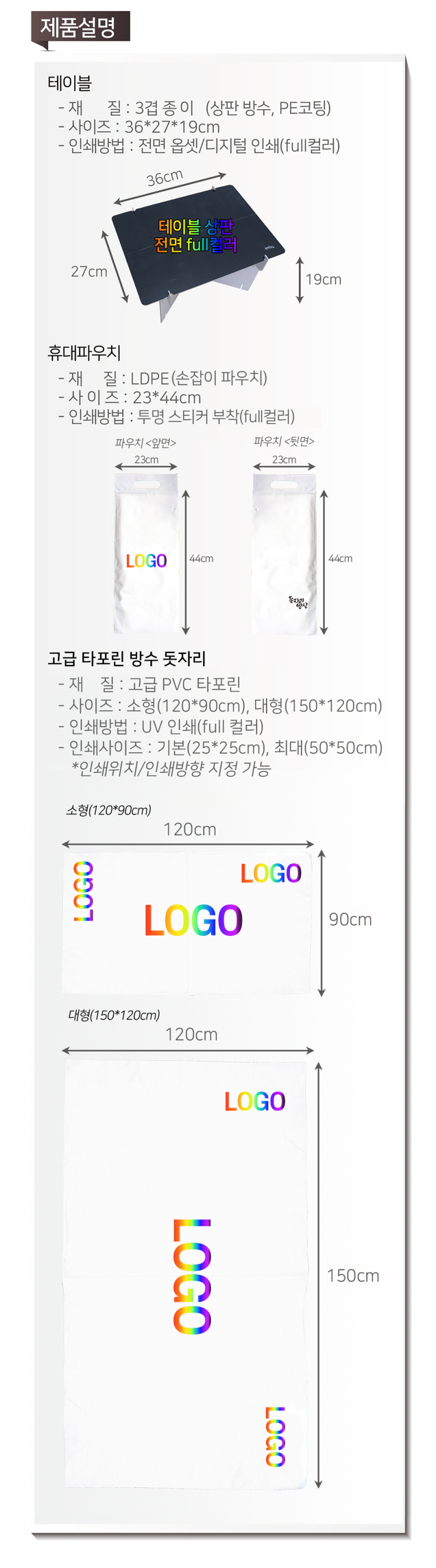 - 테이블 파우치 인쇄는 칼라 투명스티커로 제작되며, 추가비용 발생됩니다.(별도문의)