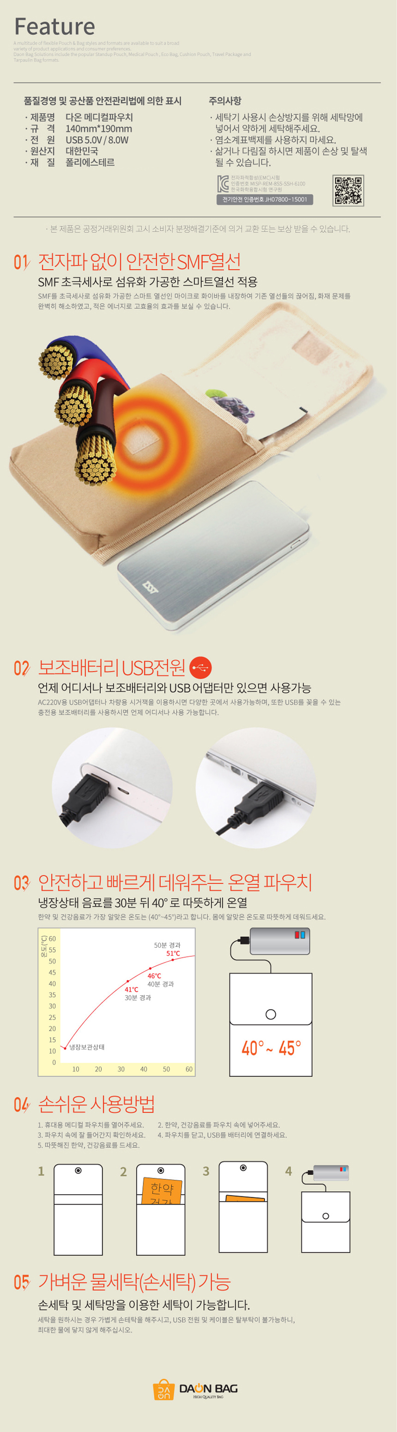 * 스마트열선을 사용하여 한약이나 건강음료등을 따뜻하게 데우는 파우치입니다.