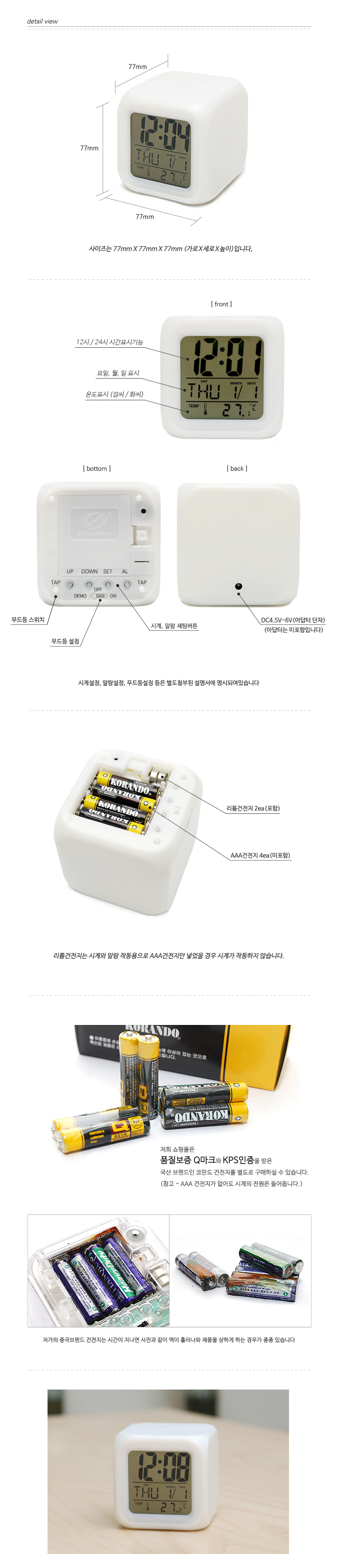 * 시계 무드등을 지속적으로 계속 켜놓으실 경우 건전지 소모가 많아 건전지가 빨리 닳을 수 있습니다.